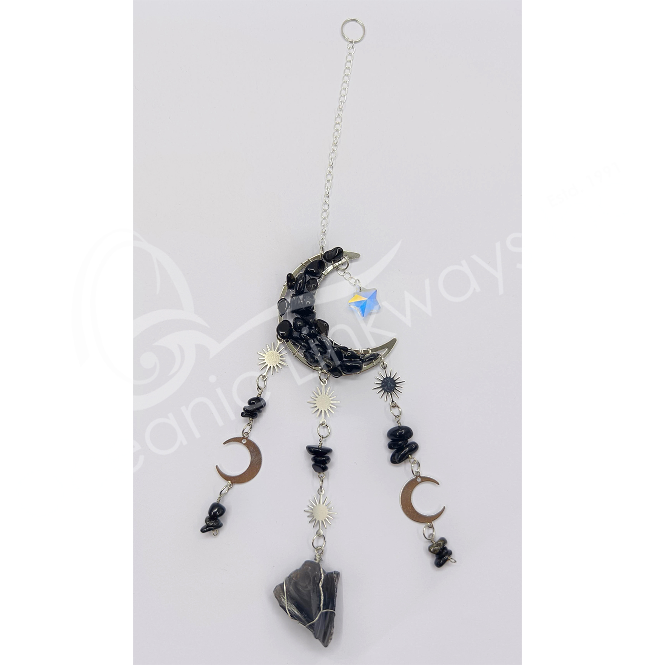 Item # 30488070HANGING – MOON WITH OBSIDIAN, BLACK CHIPS 8.5-9.5″L