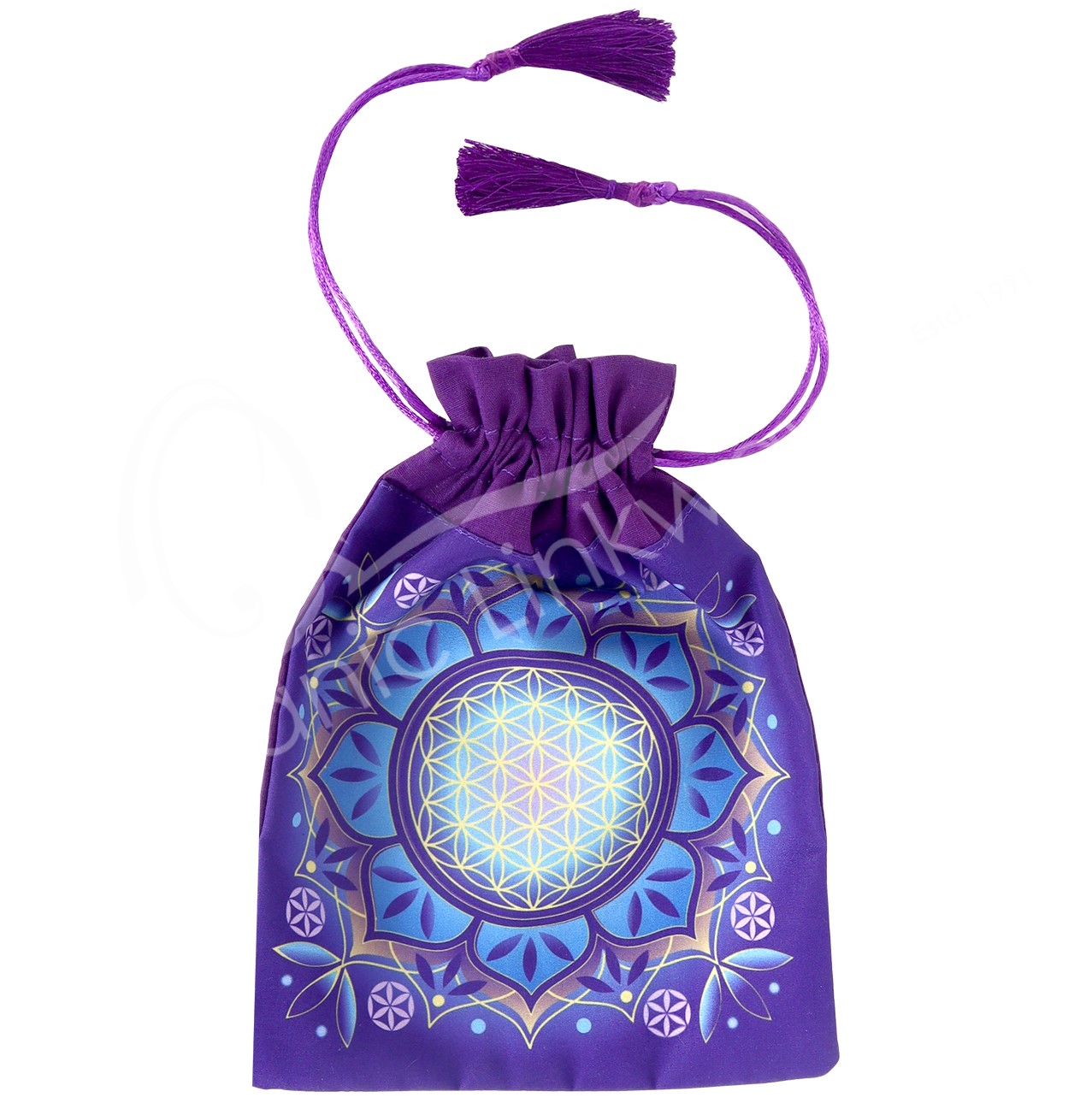 Item # 30160194 Item # 30160194PRINTED BAG – PURPLE FLOWER OF LIFE MANDALA WITH TASSELS 6 X 8″
