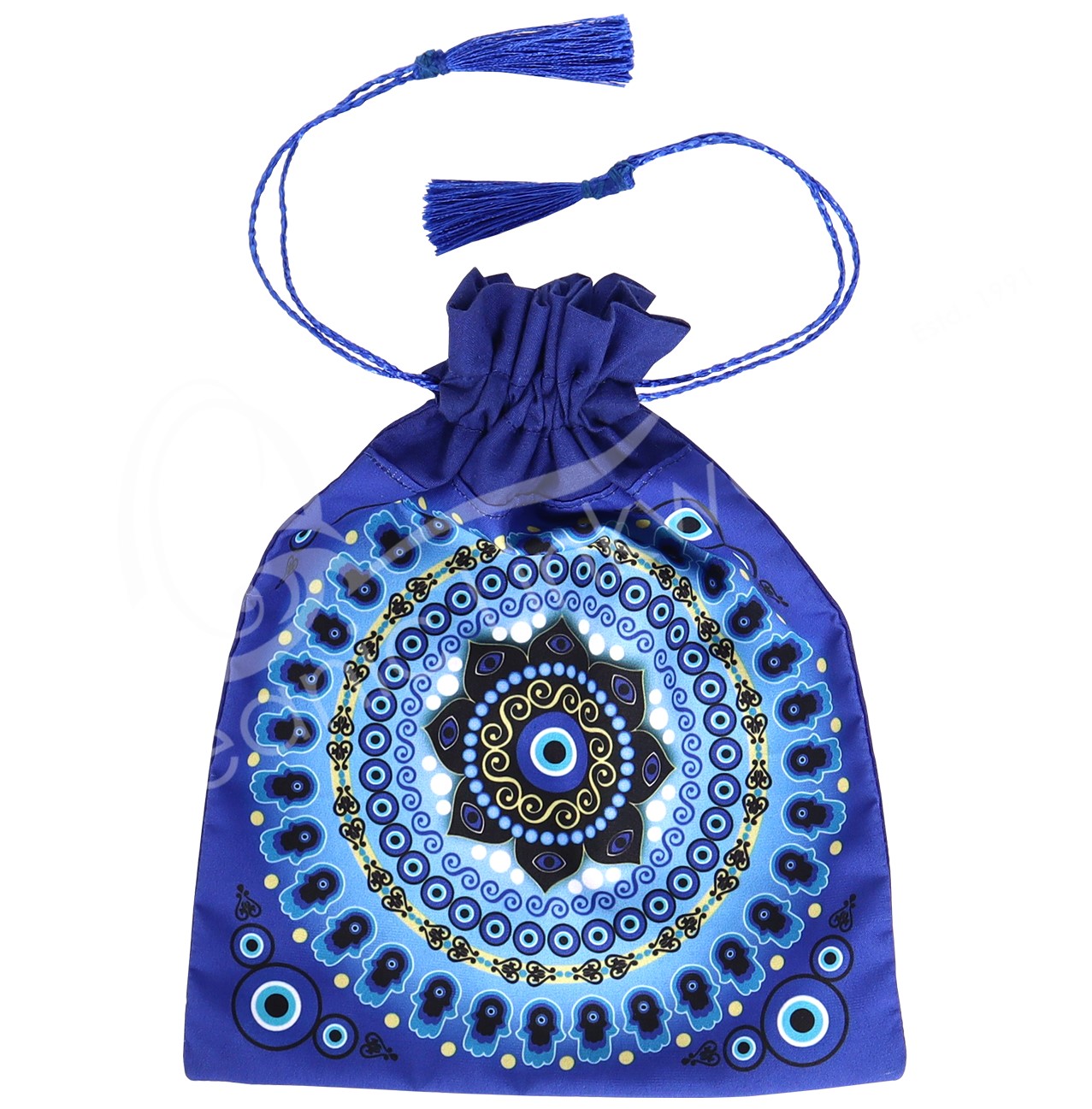 Item # 30160195 Item # 30160195PRINTED BAG – BLUE EVIL EYE MANDALA WITH TASSELS 6 X 8″