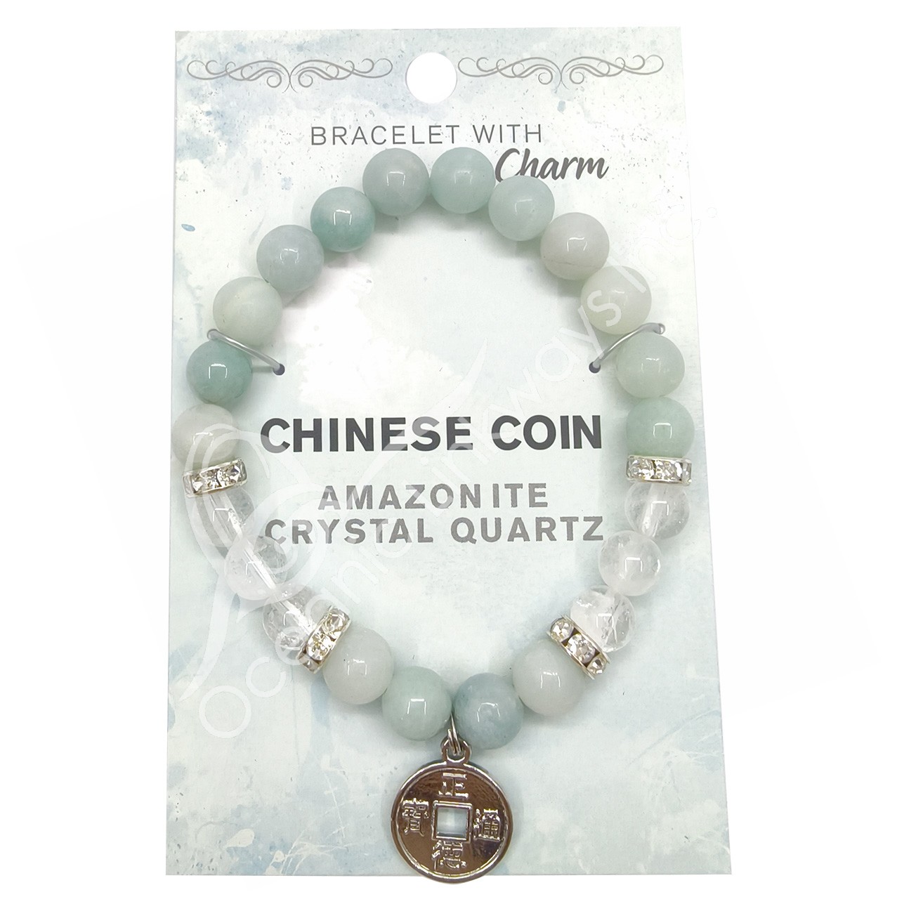 BRACELET – AMAZONITE & CRYSTAL QUARTZ CHINESE COIN (8-8.5 MM) 7.15-7.25″