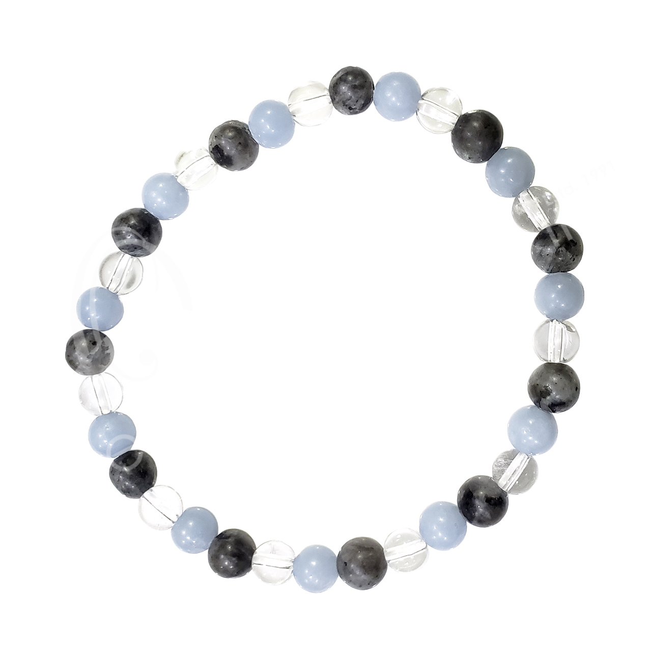 BRACELET – LARVIKITE, ANGELITE, CRYSTAL QUARTZ (6-6.5 MM) 7.15-7.25″