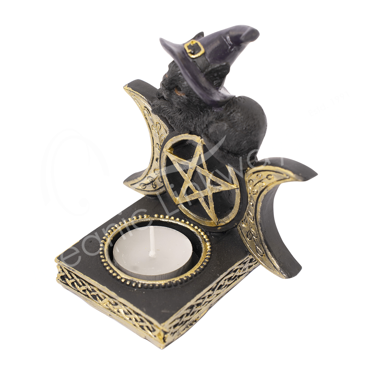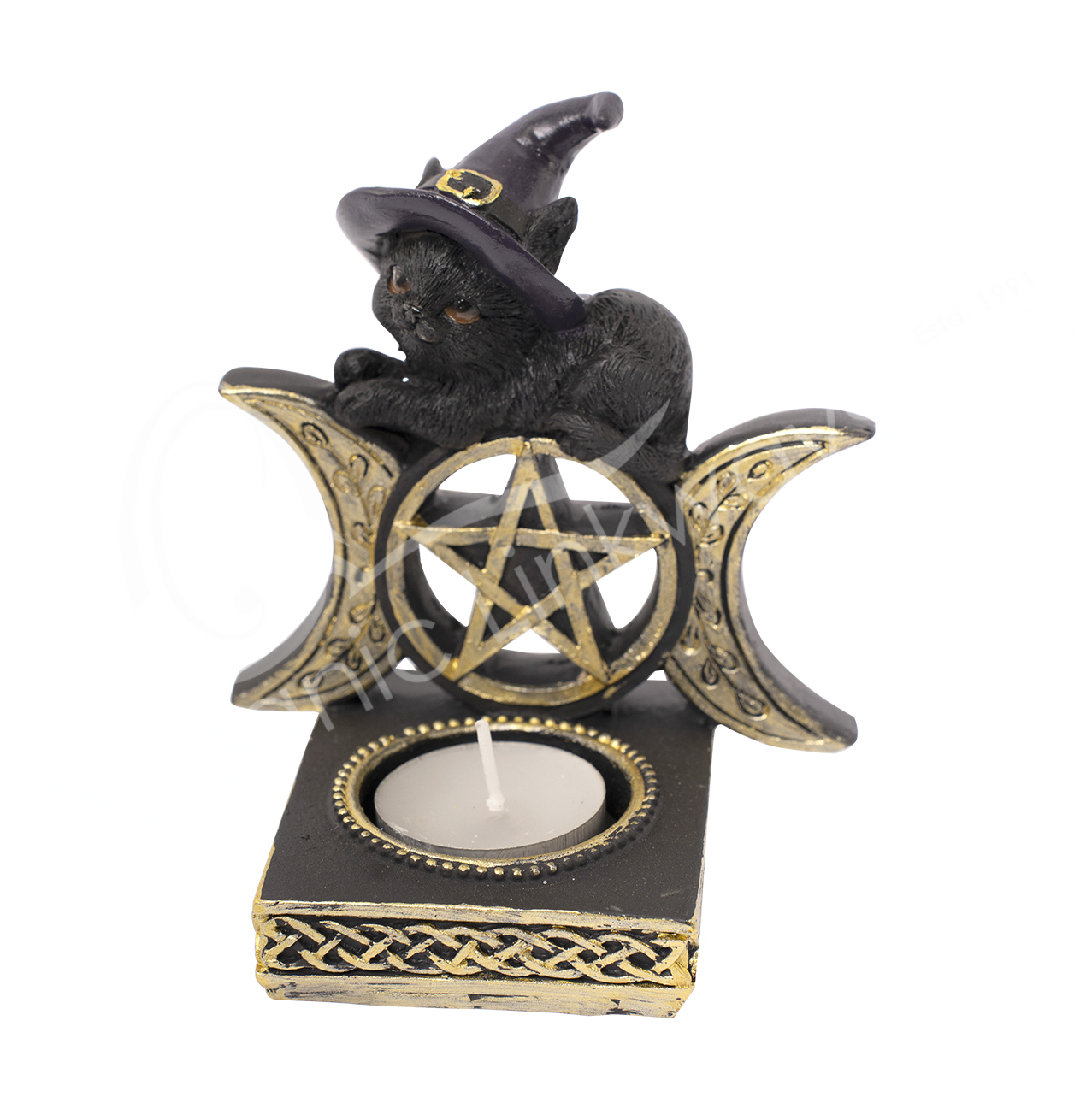 CANDLE HOLDER – BLACK CAT TRIPLE MOON PENTACLE 4.15″L X 5″H