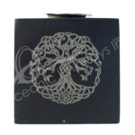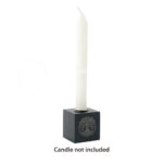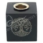 MINI CANDLE HOLDER – ONYX, BLACK WITH PYRITE CUBE WITH TREE OF LIFE ENGRAVED 1.35″W X 1.35″H