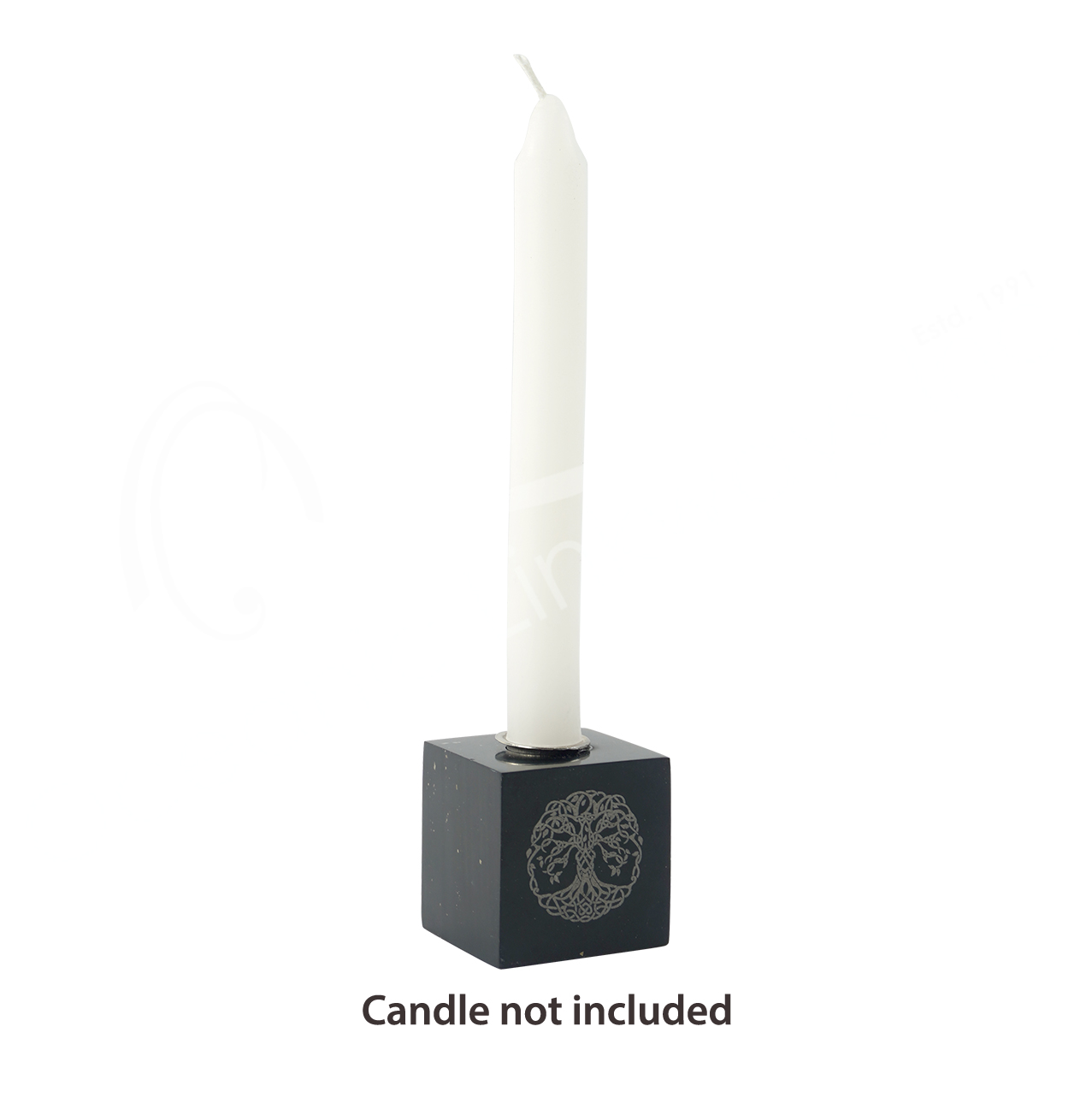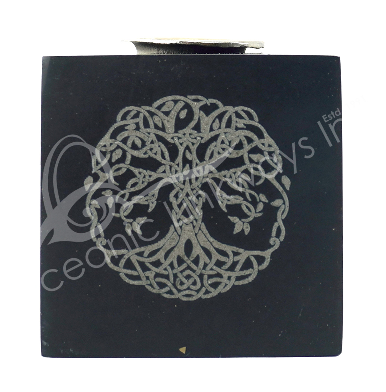 MINI CANDLE HOLDER – ONYX, BLACK WITH PYRITE CUBE WITH TREE OF LIFE ENGRAVED 1.35″W X 1.35″H