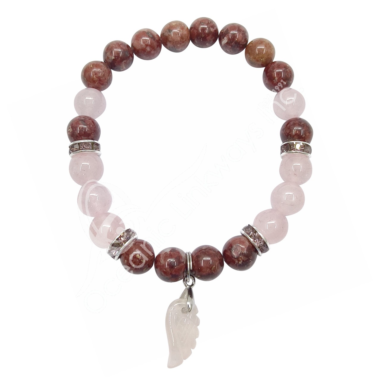 BRACELET – EUDIALYTE & ROSE QUARTZ WITH ANGEL WING CHARM (8-8.5 MM) 7.15-7.25″