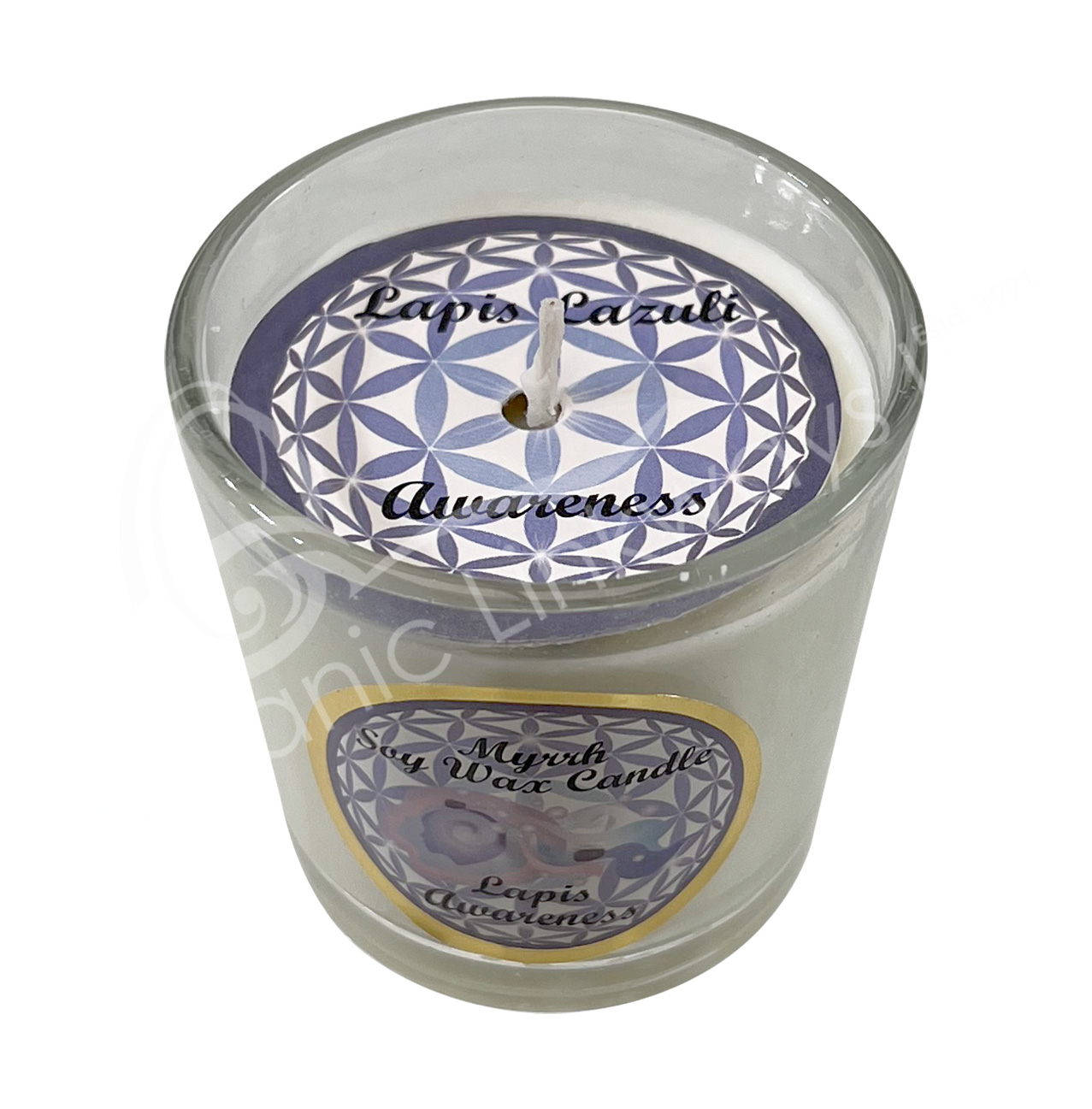 CANDLE VOTIVE – SOY WAX MYRRH WITH LAPIS LAZULI/AWARENESS (PK 6) 2.25-2.5″H X 2.25″DIA.