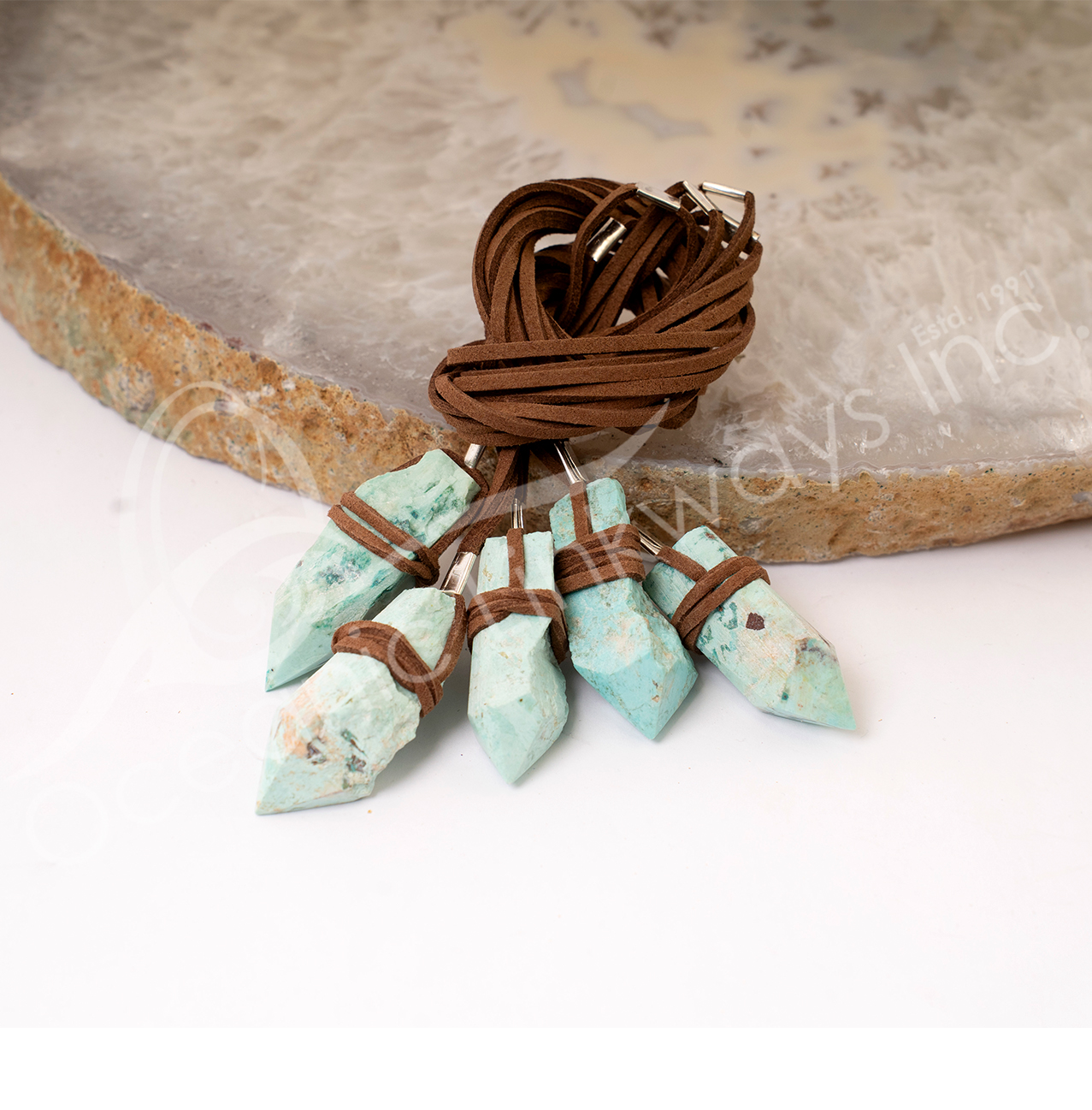 Item # 30737008(CLOSE OUT) NECKLACE – POINT TURQUOISE, INCA WRAPPED WITH LEATHER CORD 16.5-18″L