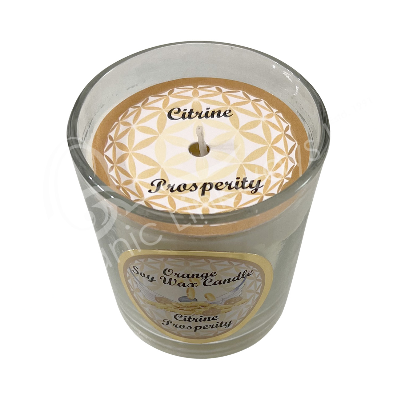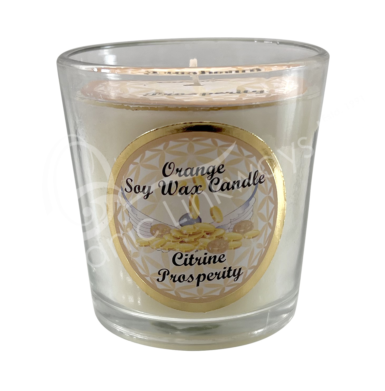CANDLE VOTIVE – SOY WAX ORANGE WITH CITRINE/PROSPERITY (PK 6) 2.25-2.5″H X 2.25″DIA.