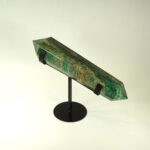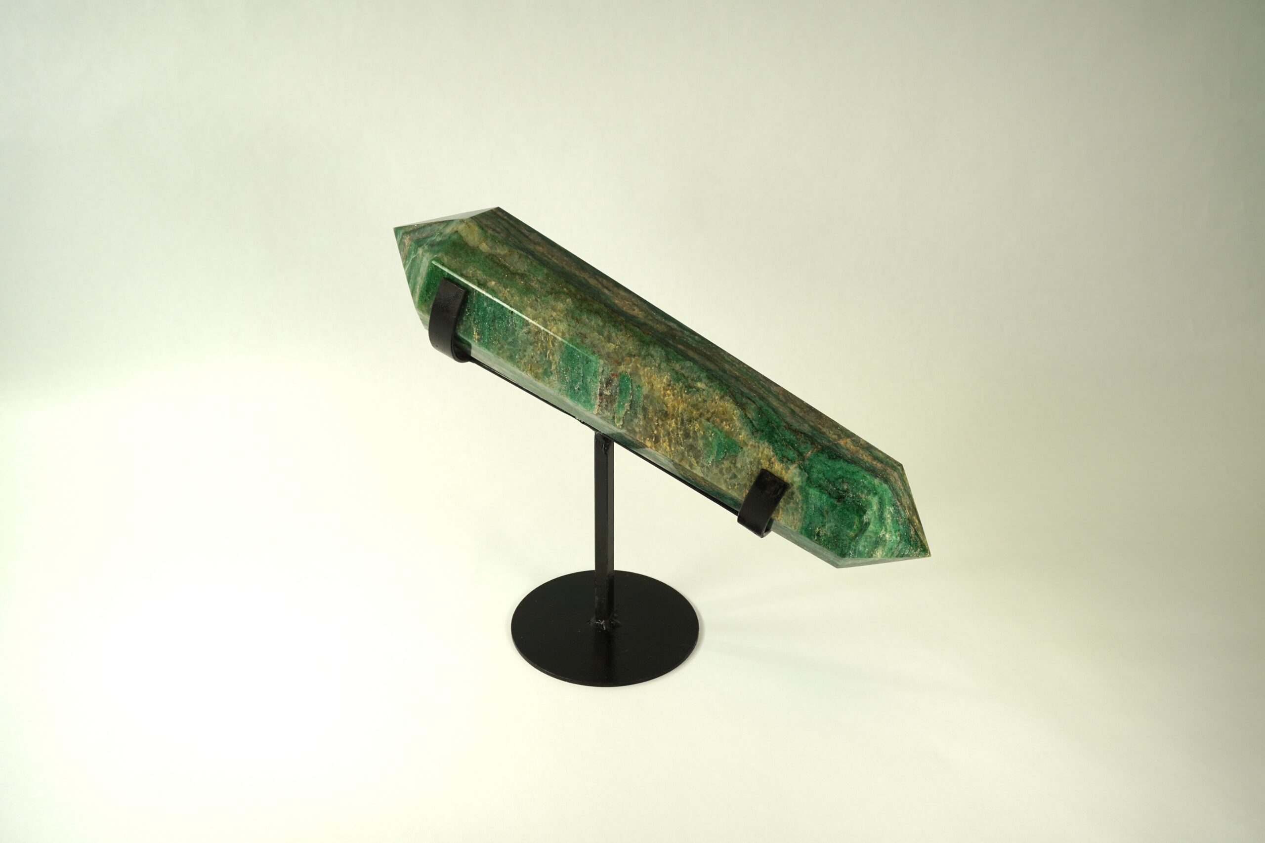 POINT – AVENTURINE, GREEN WITH QUARTZ DOUBLE TERMINATED ON METAL STAND 15.5″L X 3.25″W