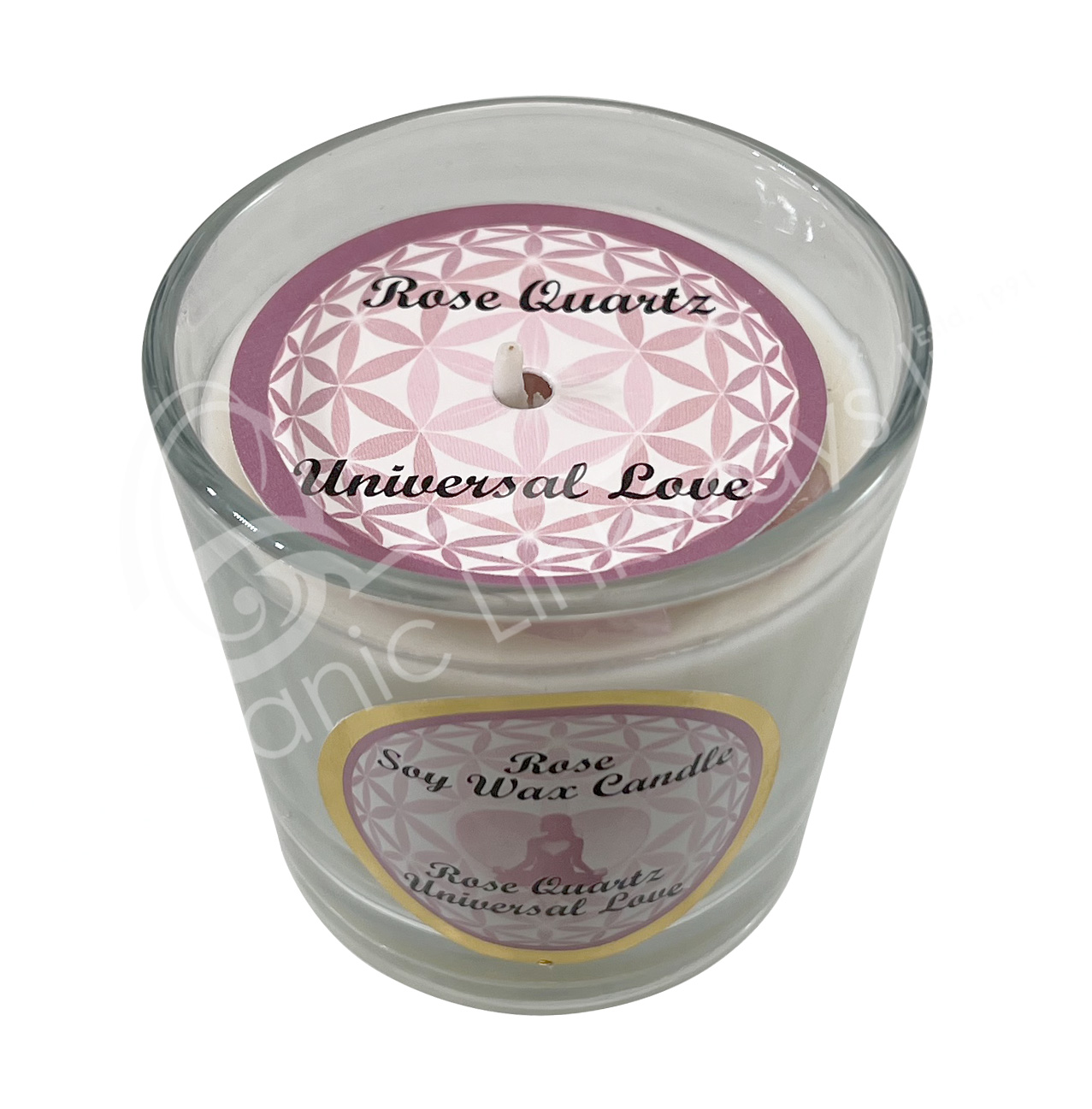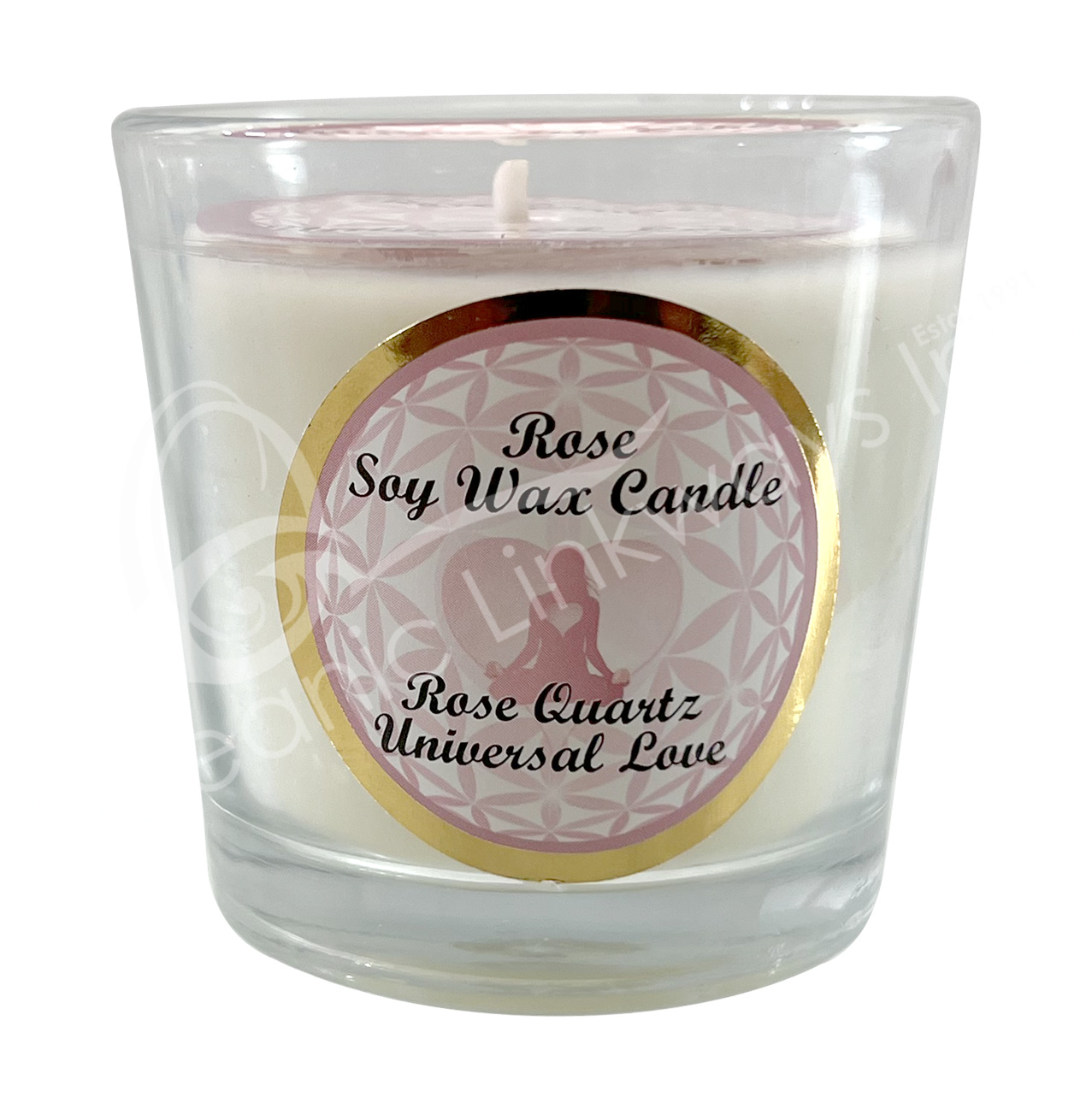 CANDLE – AROMATHERAPY ROSE/LOVE WITH ROSE QUARTZ 3″H X 3.25″DIA.
