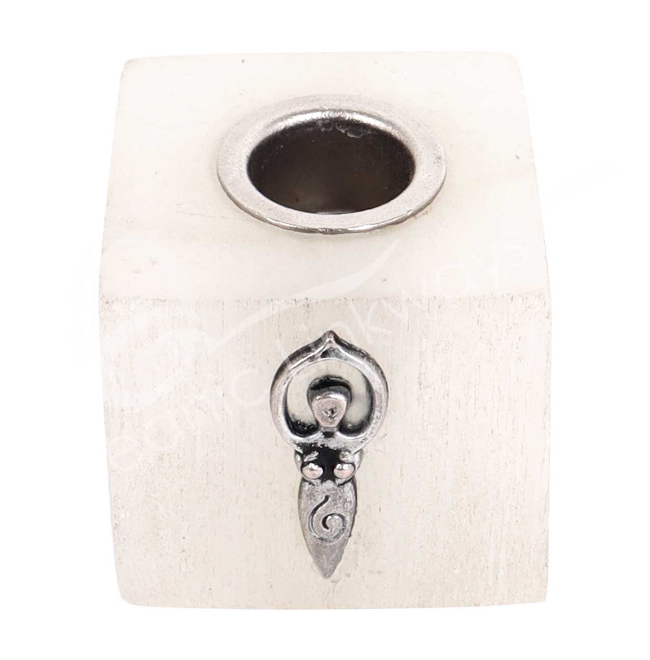 MINI CANDLE HOLDER – SELENITE CUBE WITH GODDESS CHARM (PK 3) 1.25″